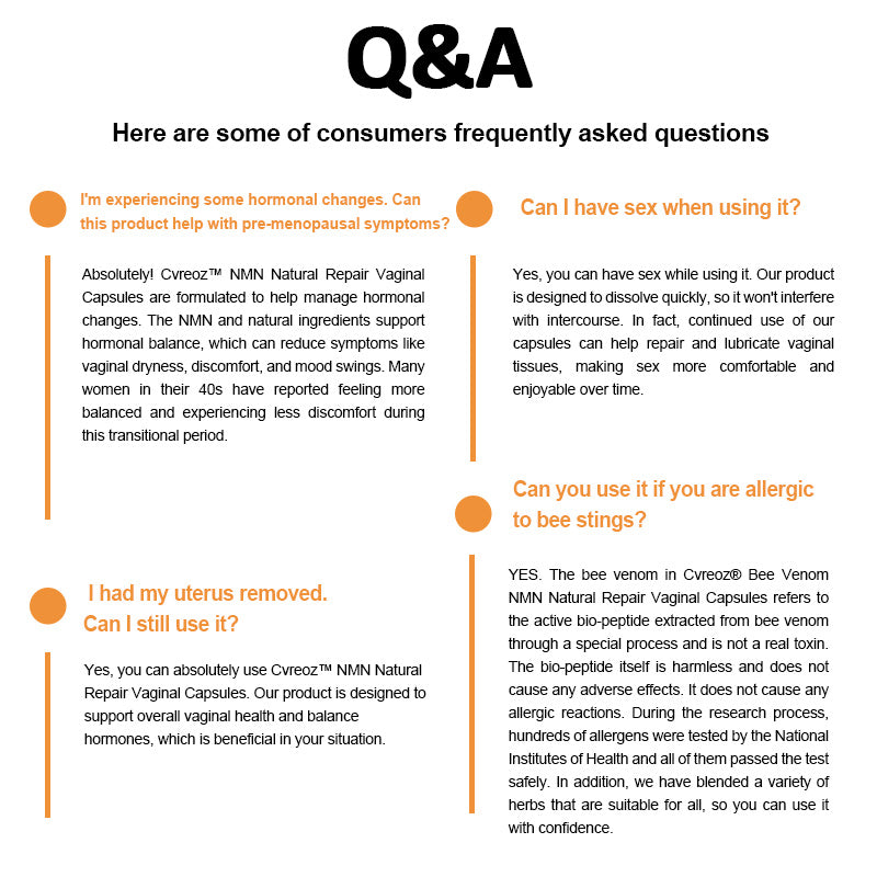 Extensive research shows that these ingredients work synergistically to balance hormones, reduce inflammation, enhance metabolism, and maintain overall health. Cvreozยฎ Bee Venom NMN Natural Repair Vaginal Capsules combine them in a scientifically formulated blend, providing a comprehensive approach to women's health. Each ingredient is backed by scientific evidence, ensuring the product's efficacy and safety, which users can trust.
