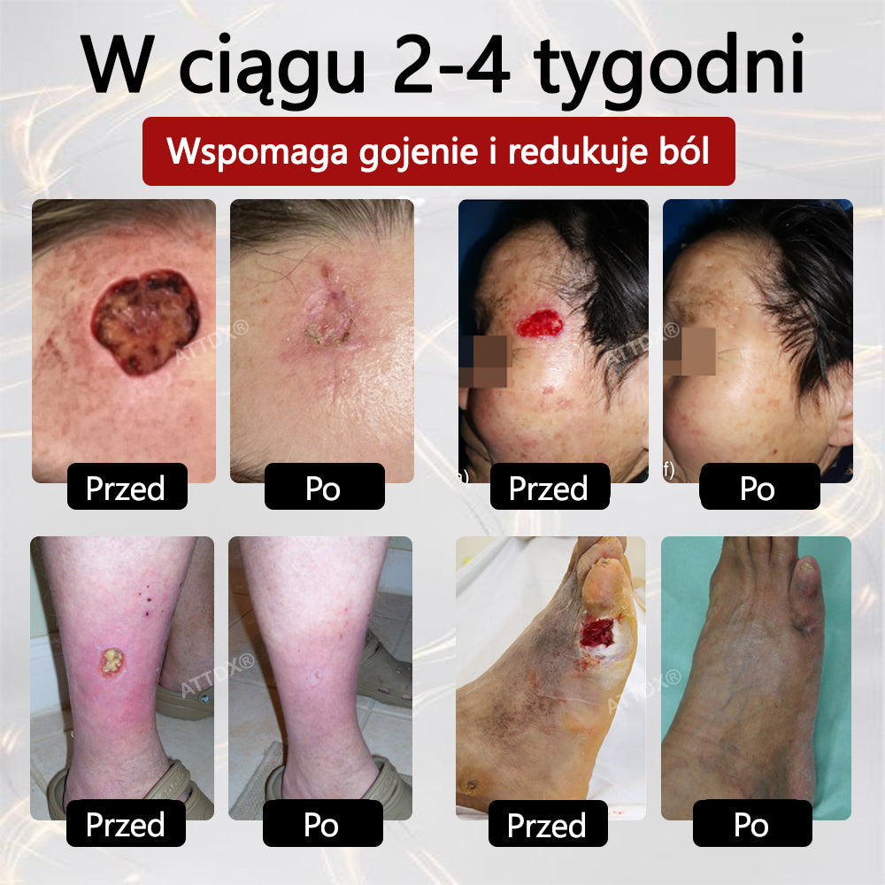 Aby uzyskać optymalne wsparcie gojenia, nakładaj 2-3 razy dziennie na czystą, suchą skórę. Dostosuj częstotliwość w zależności od potrzeb lub zgodnie z zaleceniami lekarza.