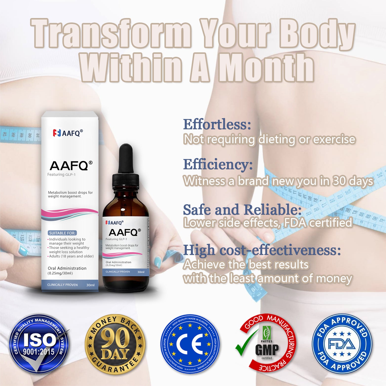Low Side Effects: Not all weight loss methods come with side effects. By taking AAFQ® Metabolism Drops orally, this innovative approach replaces traditional injections, minimizing side effects! You can get it without a doctor's prescription because it's incredibly safe!